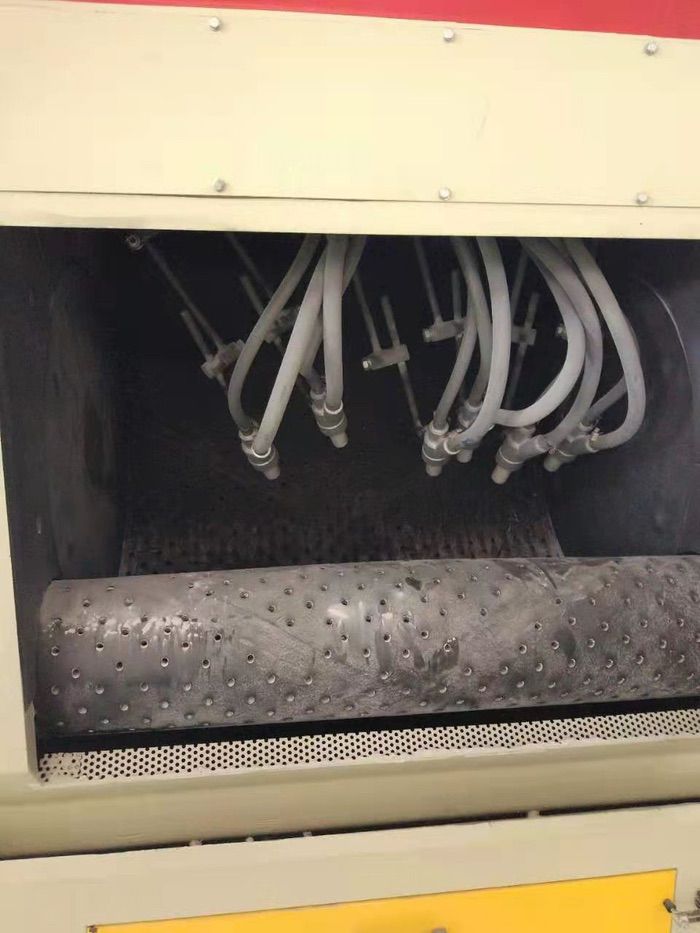 本机配置6支喷枪。生产过程中,工人将工件放置在机舱内的履带滚筒内,关闭喷砂室舱门,然后开启自动喷砂按钮;工件由于辊轴带动履带滚筒旋转而在滚筒内作翻转运动,6支往复摆动的喷枪自动对工件喷砂,喷砂完毕打开舱门,由工人对工件作最后清理后取出。